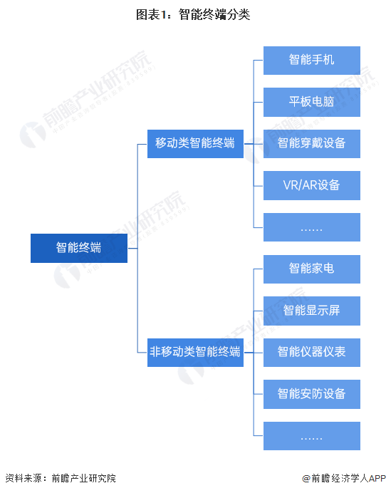 智能終端的主要類型包括移動類智能終端和非移動類智能終端。其中,移動類智能終端包括智能手機、平板電腦、智能穿戴設備、VR/AR設備等;非移動類智能終端包括智能家電、智能顯示屏、智能儀器儀表、智能安防設備等。